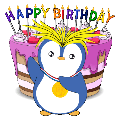A cute penguin with a medal stands in front of a festive birthday cake with "HAPPY BIRTHDAY" candles.