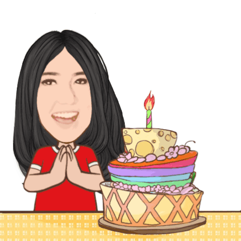 A cartoon woman with black hair blows out candles on a colorful birthday cake, then celebrates happily with a 'Happy Birthday' sign.