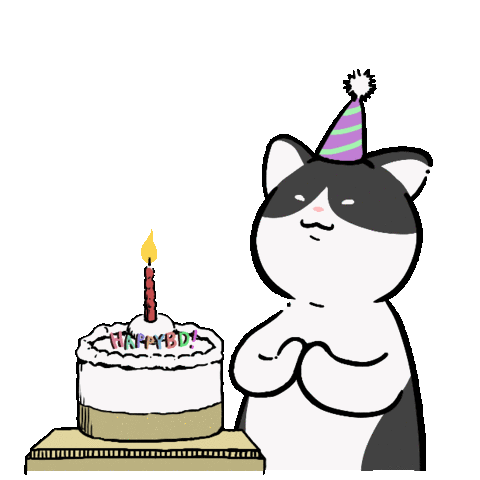 An adorable animated cat wearing a party hat looks happily at a birthday cake with a lit candle, ready to celebrate.