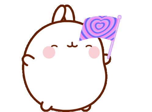Molang, the cute cartoon rabbit, proudly holds a waving bisexual pride flag on a stick.