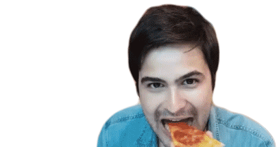 a man with a beard is wearing a blue shirt and making a face .