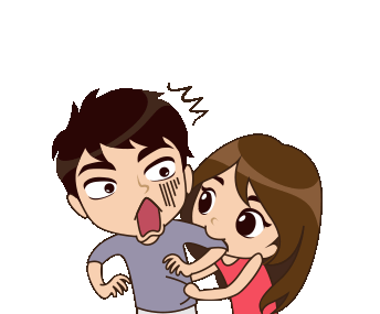 A cute cartoon girl playfully bites her boyfriend's side, who reacts with surprise and discomfort.