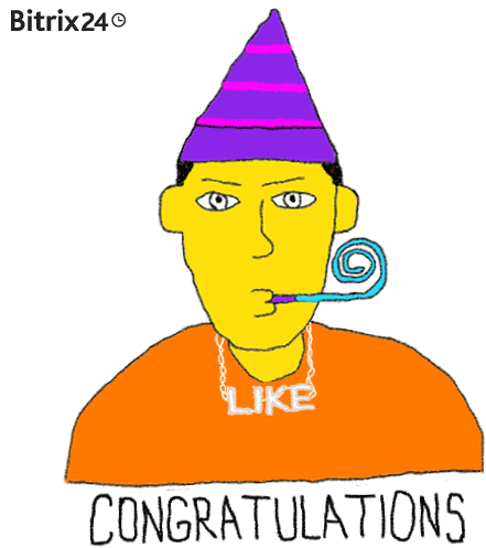 A person wearing a party hat and a "LIKE" necklace blows a party horn, with "CONGRATULATIONS" written below, featuring Bitrix24 branding.