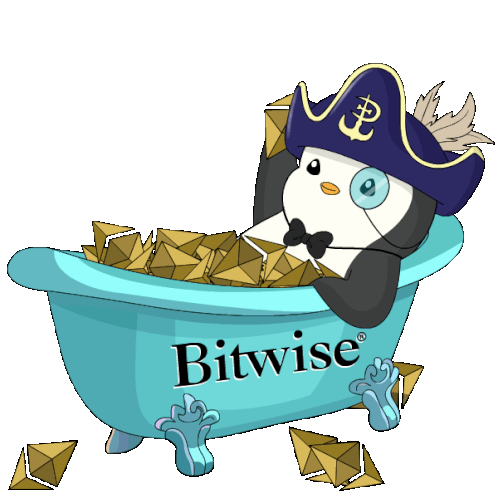 A charming penguin in a pirate hat and monocle relaxes in a bathtub filled with golden crypto assets, featuring the Bitwise logo.
