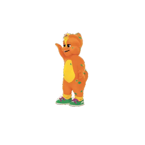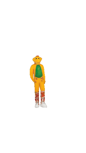 Bj the Dinosaur, a yellow character with a green shirt, performs a fun and energetic dance.