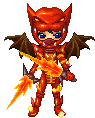 a pixel art of a boy in a red armor with wings holding a sword and bow .