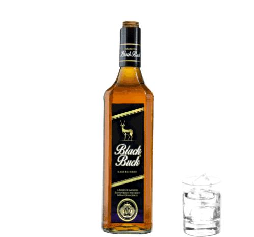 A bottle of Black Buck whiskey pours amber liquid into a glass filled with ice, then stands upright.