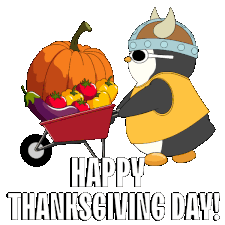 A cute penguin in a Viking helmet pushes a wheelbarrow full of harvest vegetables for Thanksgiving.