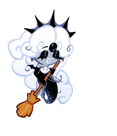 Black Pearl Cookie from Cookie Run Kingdom, a dark-themed character with cloud-like hair and a spiky crown, holding a broom.