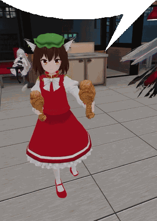 Blackcat Chen, an anime girl with cat ears and tail, happily dances with two fried KFC chicken drumsticks.