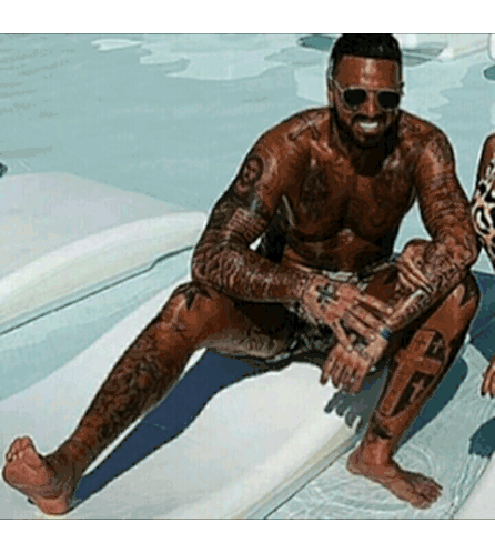 Blago Jesus, a heavily tattooed man with a deep tan, relaxes in a pool in Dubai, wearing sunglasses and smiling.