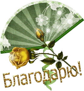 A green fan with a yellow rose and the Russian word 'благодарю' (thank you) animated as a sticker.