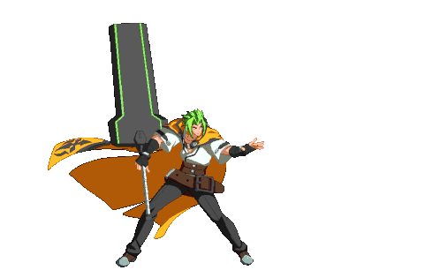 Blazblue character Kaguramutsuki lunges forward with a large weapon and flowing yellow cape in this animated sticker.