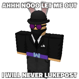 A Roblox character, Bldnhill Faave, with bunny ears and sunglasses, exclaims 'AHHH NOOO LET ME OUT I WILL NEVER LUKEPOST'.