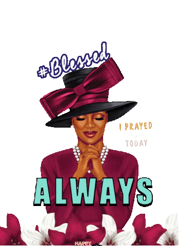 An animated sticker of a woman in a hat with hands clasped in prayer, featuring the changing text '#Blessed I PRAYED TODAY ALWAYS'.
