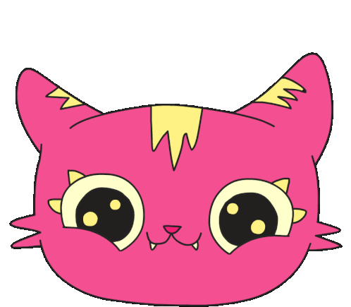 A cute animated sticker featuring a pink cartoon cat's head with large, expressive eyes, blinking playfully.