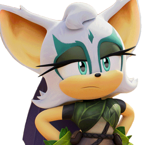 Rouge The Bat from Sonic Prime blinks with a confused expression, wearing her unique green and dark outfit.
