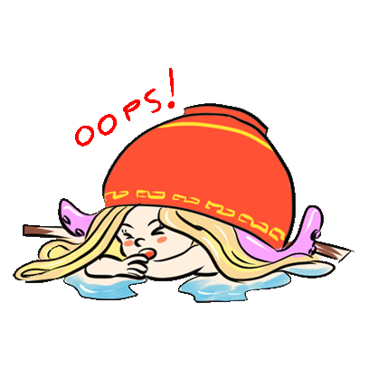 a cartoon drawing of a woman with a red bowl on her head and the words oops written above her