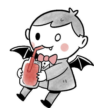 A cute, chibi-style vampire boy with bat wings drinks red liquid from a jar with a straw, a playful take on blood donation.