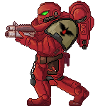 Animated pixel art sticker of a Blood Ravens Primaris Space Marine from Warhammer 40k, armed with a bolter and shield, marching forward.