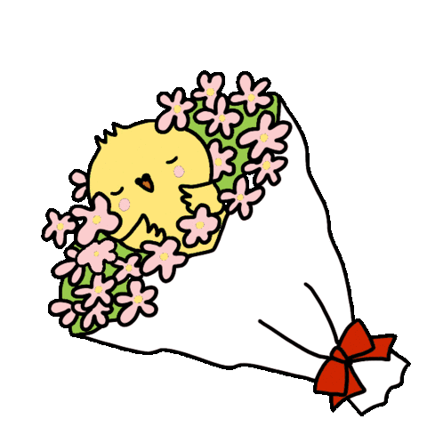 An adorable yellow chick peeks out from a vibrant bouquet of pink blossoms, surrounded by floating red hearts.