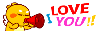 A cute yellow cartoon character enthusiastically blows a red megaphone, proclaiming 'I LOVE YOU' in a fun, animated sticker.
