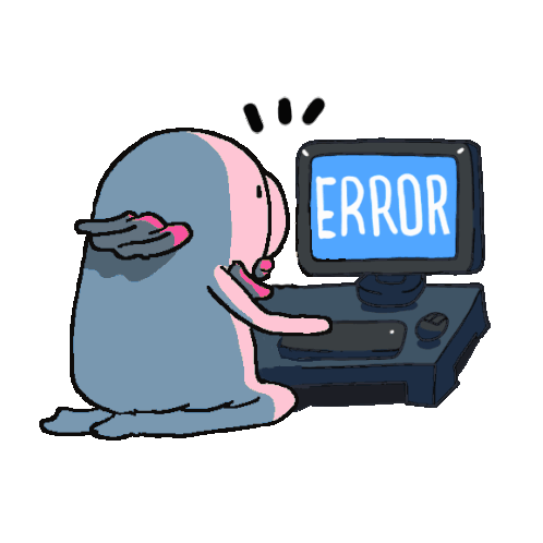 A cartoon Blub Blub Coin blobfish covers its eyes in distress as a computer screen displays an 'ERROR' message, symbolizing digital frustration.
