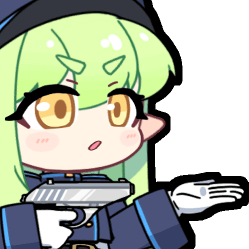 Tachibana Nozomi from Blue Archive, holding a pistol and making a 'give me' gesture with a surprised expression.
