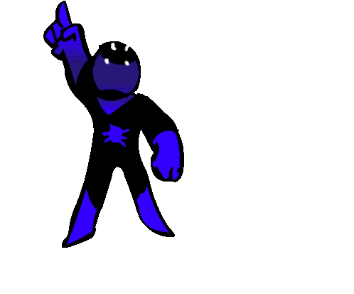 a cartoon character in a black suit and blue boots is standing up with his arms in the air .