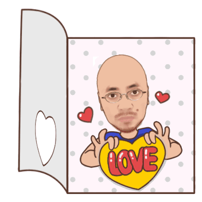 Bluekutug cartoon man holds a yellow heart with 'LOVE' on it, surrounded by small red hearts.