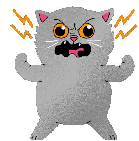 An angry Blukittie Blucat, a grey Scottish Fold cat with blue eyes, looking grumpy and ready to pounce.