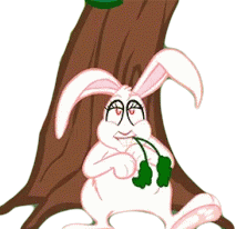 A cute cartoon rabbit with glasses, possibly from Galinha Pintadinha, sits by a tree, happily chewing on green leaves.