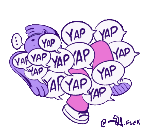 An animated Blypho character overwhelmed by numerous speech bubbles, all containing the word 'YAP'.