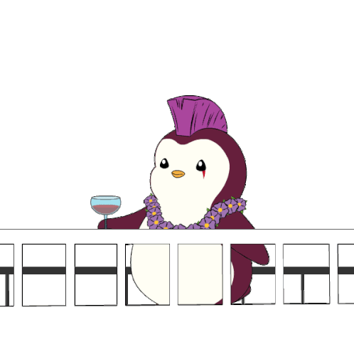 A cute cartoon penguin with a purple mohawk and lei sips a drink while relaxing on the deck of a luxurious yacht, enjoying a peaceful cruise.