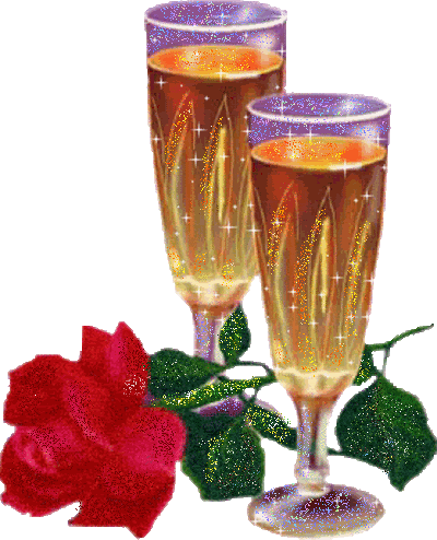Böbe Giffjei celebrates with a red rose, two champagne glasses, and a bottle of bubbly.
