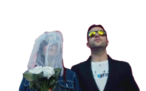A couple, possibly newlyweds from Ladilla Rusa, stands together as confetti falls around them, celebrating their special day.