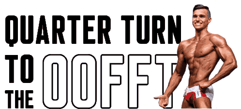 A muscular bodybuilder poses for a 'Quarter Turn To The Oofft' with 'Team Sammy Shreds' branding, showcasing fitness.