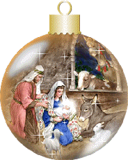 An animated Christmas ornament sticker featuring a classic Nativity scene with Mary, Joseph, baby Jesus, and animals in a stable.