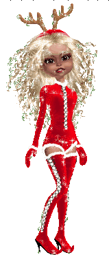 Animated Christmas sticker featuring a cute blonde girl in a festive red outfit with antlers, sparkling joyfully.