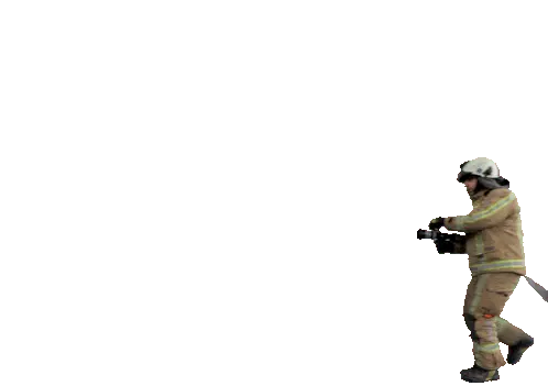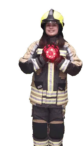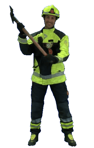 A smiling bombero firefighter in a yellow and black uniform holds an axe, which then transforms into a different rescue tool, ready for action.