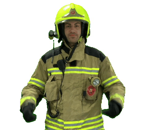 A firefighter in full uniform gives two enthusiastic thumbs up, showing approval and readiness.