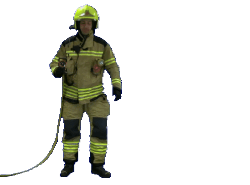 A firefighter, or bombero, kneels and sprays a powerful stream of water from a firehose.