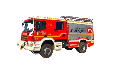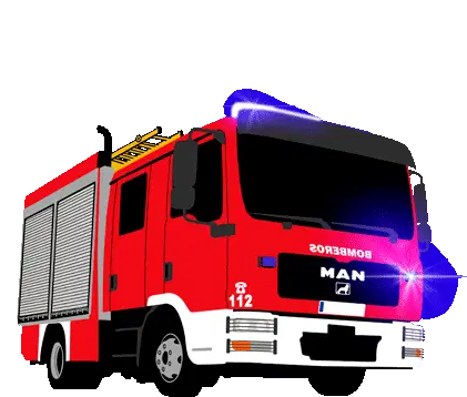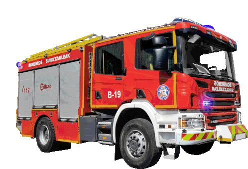A detailed red Scania fire truck from Bilbao, featuring flashing blue lights and emergency numbers.
