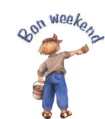 A charming animated sticker featuring a character painting "Bon Weekend" in glittery blue letters, perfect for weekend greetings.