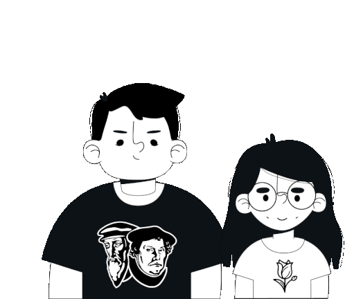 Bonn and Gillian celebrate their wedding, depicted as a cartoon couple wearing unique t-shirts with historical figures and a tulip.