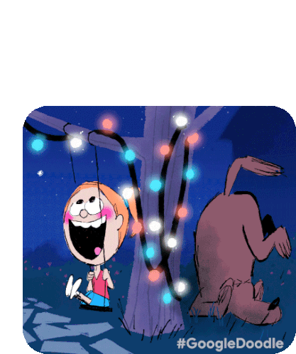 A joyful Google Doodle celebrating Bastille Day with a girl on a swing, a playful dog, and festive lights.