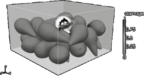 Bonnie Boniface, the pear wiggler from In Stars and Time, wiggles amidst pear-shaped objects in a damage simulation.