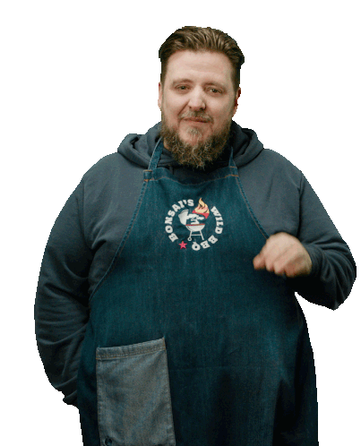 Bearded man in Bonsai's Wild BBQ apron gestures 'perfect' taste, celebrating delicious food.