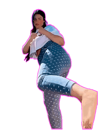 A woman in polka dot pants and a white crop top strikes a playful martial arts pose with a 'TOOT' sound effect.
