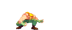 A pixel art animation of a muscular man, possibly Guile, performing a boomerang attack or flexing.